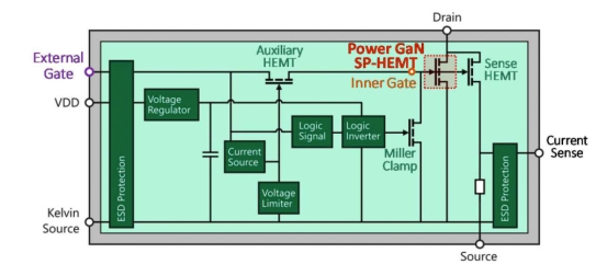 Cambridge GaN Devices 是一家無晶圓廠半導(dǎo)體公司,開發(fā)了一系列額定電壓為 650 V 的硅基 GaN 功率器件。一種稱為 ICeGaN? 的新型柵極接口以及感測和保護(hù)電路被單片集成到單個(gè)芯片解決方案中。圖 1 顯示了 ICeGaN? 電路的原理框圖。主功率 HEMT 是肖特基 p 柵極 GaN HEMT,額定電壓為 650V,V th約為 1.6V。
