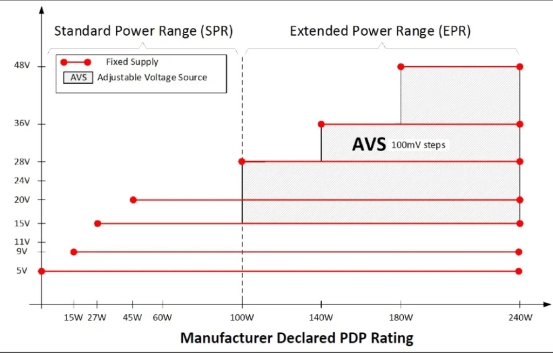 在 USB-PD 3.2 中,AVS 對于某些功率輸出范圍(27-100 W)是必需的。此功能允許充電器調(diào)整電壓輸出以更好地滿足設(shè)備需求,從而大大提高充電效率。