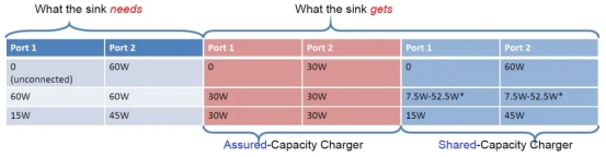 圖 4 顯示了多端口充電器的示例。此處,兩個(gè)端口上可用的總功率小于 60 W。共享算法由實(shí)施者決定。每個(gè)端口所需的最小功率為 7.5 W。