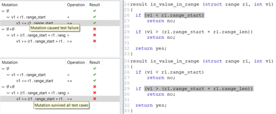 在圖4的左下角,您可以看到幸存的突變("突變在所有測試案例中幸存下來");這個突變改變了測試對象的第二個IF指令中的關(guān)系操作符(圖4的右下角突出顯示)從"&ttt;"變?yōu)?&ttt;="。沒有測試用例通過失敗檢測到此更改。這一點值得懷疑,需要進行調(diào)查。
