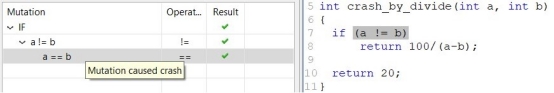 在上面的例子(圖7)中,用一個測試用例測試了崩潰_比_除法函數(shù)(),兩個參數(shù)都在這個測試用例中。 A 和 b 有相同的價值。這個測試案例殺死了"!======='======'在-教授的決定中。