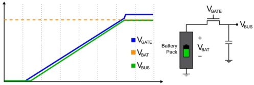 MP279X家族使用一個(gè)高側(cè)面的架構(gòu),它提供了強(qiáng)大的保護(hù),同時(shí)最小化BOM。此外,高精度電荷泵控制允許一個(gè)N通道MOSFET軟連接功能,不需要任何額外的預(yù)充電電路,進(jìn)一步最小化BOM大小和成本。通過緩慢增加保護(hù)FET的門電壓來實(shí)現(xiàn)軟啟動(dòng),允許一小電流通過保護(hù)來預(yù)充電負(fù)載(見圖3)。可以對幾個(gè)參數(shù)進(jìn)行配置,以確保安全過渡,例如最大允許電流,或保護(hù)費(fèi)關(guān)閉而不觸發(fā)故障的時(shí)間。