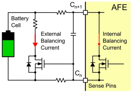 被動(dòng)平衡是最常見的平衡電池電壓的方式,它需要放電最多的電池,直到它們都有相同的電荷。在AFES中,被動(dòng)的細(xì)胞平衡可以在外部或內(nèi)部實(shí)現(xiàn)。外部平衡允許更大的平衡電流,但也增加了BOM(見圖4)。