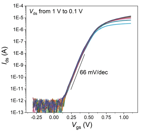 在孔內(nèi),估計有十個短單鏈 DNA 分子的結(jié)合產(chǎn)生了 40 mV 的清晰信號,這是之前 FinFET 器件信號的兩倍(圖 2)。值得注意的是,其電氣特性接近理想狀態(tài)(圖 3),亞閾值擺幅為 66 mV/dec,接近理論最小值 60。這表明電解質(zhì)門控在納米孔內(nèi)有效發(fā)生。