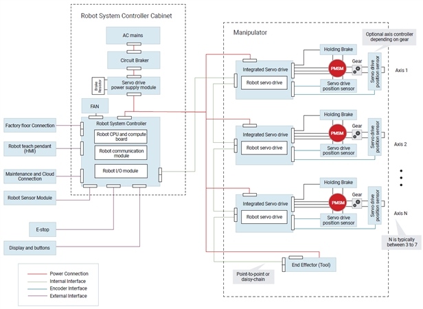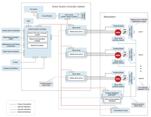 集中控制架構(gòu)可以滿足高功率自動(dòng)化系統(tǒng)的性能和效率設(shè)計(jì)要求,例如具有大有效負(fù)載的工業(yè)機(jī)器人,但它們也需要添加電纜。這些電線不僅增加了成本,而且還會(huì)磨損并需要維護(hù)。