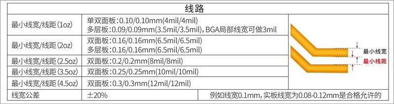 嘉立創(chuàng)PCB最小線寬、線距工藝參數(shù)如下圖所示: