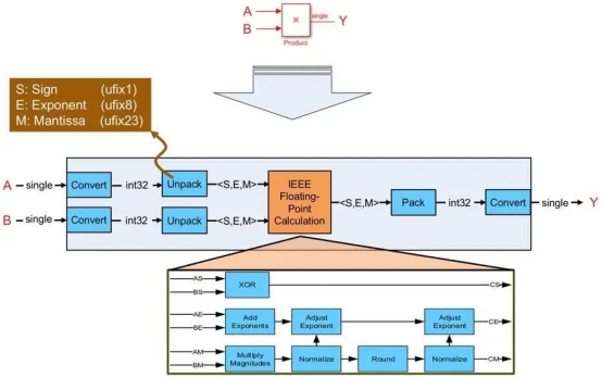 HDL編碼器 實現(xiàn)了單精度算法,模擬的基礎(chǔ)數(shù)學(xué)在FPGA或ASIC資源(圖1)。生成的邏輯將輸入浮點信號解成符號、指數(shù)和尾數(shù)--分別為1、8和23位寬的單個整數(shù)。