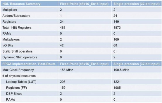 當您比較從浮點和固定點實現(xiàn)中獲得的結(jié)果時,記住浮點計算比簡單的固定點算法需要更多的操作。使用單精度將導(dǎo)致在部署到FPGA或ASIC時使用更高的物理資源。如果電路區(qū)域是一個問題,那么您將需要交換更高的精度和資源使用。您也可以使用浮點和固定點的組合減少面積,同時保持單精度,以實現(xiàn)高動態(tài)范圍的數(shù)字密集計算。