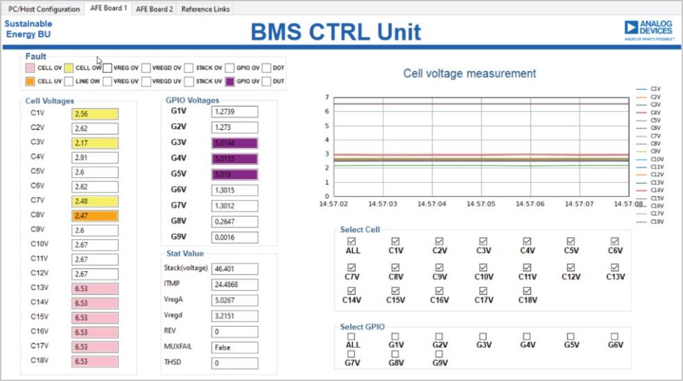 BMS標(biāo)簽頁(yè)顯示ESCU處理的每個(gè)連接AFE的測(cè)量結(jié)果,如圖5所示。BMS標(biāo)簽頁(yè)包含AFE板的電池和GPIO電壓、狀態(tài)及故障讀數(shù)。電池電壓測(cè)量結(jié)果也以圖形方式實(shí)時(shí)呈現(xiàn)。