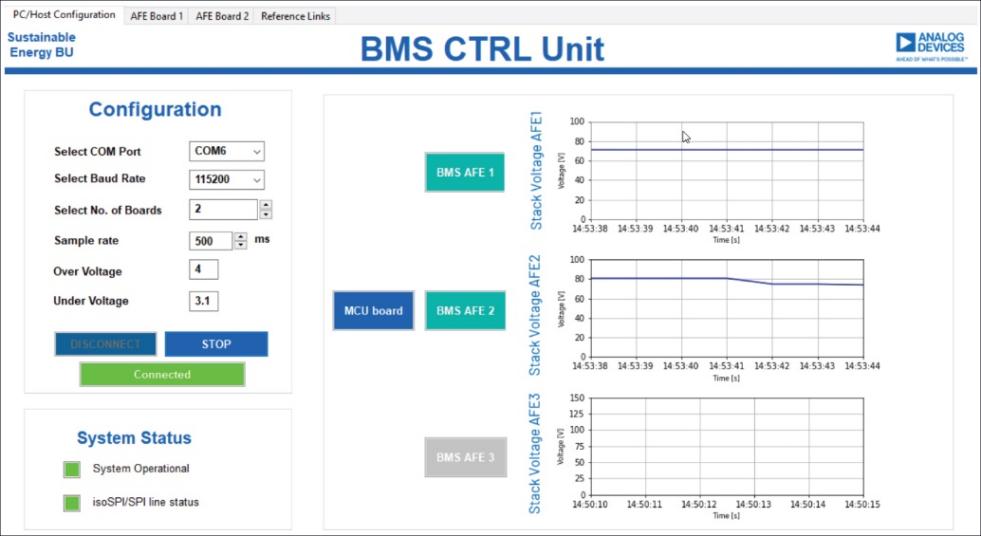 系統(tǒng)標(biāo)簽頁(yè):這是應(yīng)用程序的主登陸頁(yè)面(圖4)。用戶(hù)可在此建立串行PC通信,選擇連接的AFE板數(shù)量,以及確定用于過(guò)壓和欠壓檢查的測(cè)量間隔和閾值。點(diǎn)擊連接后,用戶(hù)即可開(kāi)始測(cè)量。兩個(gè)系統(tǒng)狀態(tài)燈都變成綠色(如圖4所示)時(shí),會(huì)根據(jù)用戶(hù)輸入的電路板數(shù)量而顯示相應(yīng)的測(cè)量標(biāo)簽頁(yè)。