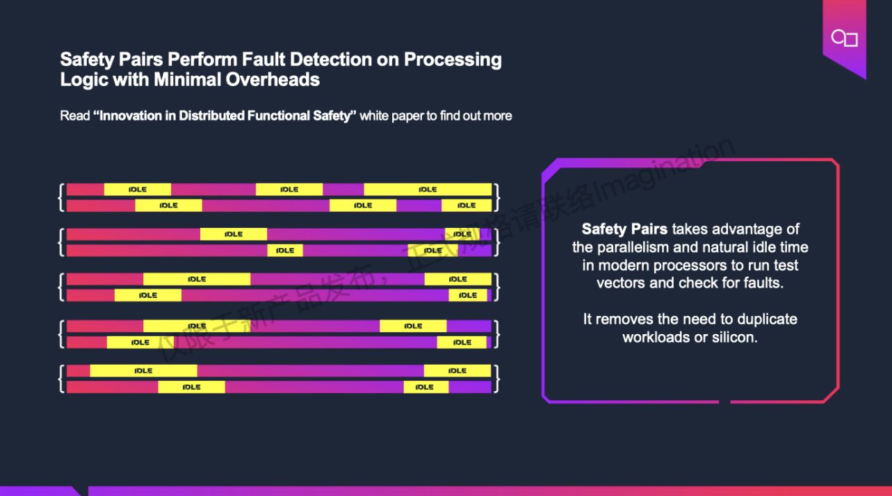 這種創(chuàng)新的技術(shù)叫做Safety Pairs,這是一種分布式功能安全機(jī)制,是Imagination的最新專利技術(shù),它通過利用現(xiàn)代處理器中的并行性和自然空閑時間來實(shí)現(xiàn)故障檢測,且無需對工作負(fù)載或硬件進(jìn)行重復(fù)處理,從而減少了開銷。