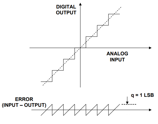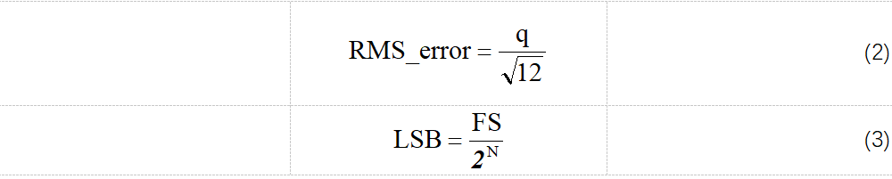 下圖是理想ADC的量化噪聲示意圖,從下圖可以看到,對(duì)于一個(gè)線性輸入的模擬信號(hào),ADC會(huì)產(chǎn)生臺(tái)階式的輸出,這個(gè)輸入和輸出的誤差波形近似于一個(gè)峰峰值q=1LSB的鋸齒波,它的有效值RMS計(jì)算過程見公式(2)(q=1LSB),LSB計(jì)算過程見公式(3),其中FS是ADC的輸入電壓范圍。