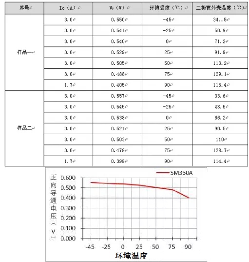 環(huán)境溫度對絕大部分電子元器件的影響無疑是巨大的,肖特基二極管當(dāng)然也不例外,在高低溫環(huán)境下通過對SM360A的實(shí)測數(shù)據(jù)表的關(guān)系曲線可知道:肖特基二極管的導(dǎo)通壓降與環(huán)境溫度成反比。