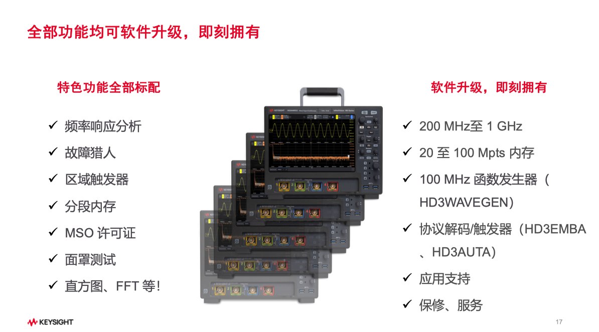 “整個InfiniiVisionHD3系列示波器的功能非常全面,特別是為了保護用戶的投資,很多特色的功能,或者用戶認為非常有價值的功能,我們全部標配。比如‘故障獵人’、分段存儲,還有電源工程師喜歡的波特圖測試等;我們的區(qū)域觸發(fā),這也是所見即所得的一個觸發(fā)模式?!敝烊A朋分享到,“包括我們首次把16個數字通道、模板測試、直方圖、FFT等功能都集成至這一系列中,用戶只需要買一臺硬件,就可以擁有所有軟件。”
