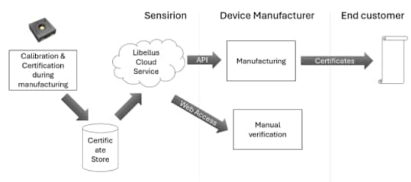圖2:該圖說明了開發(fā)人員如何在生產(chǎn)過程中使用Sensirion的Libellus云服務(wù)來驗證產(chǎn)品中內(nèi)置特定傳感器的證書,并向最終客戶提供證書(圖源:Sensirion)
