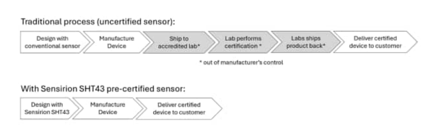 圖1: 經(jīng)過認證的SHT43傳感器省去了裝配后的第三方認證步驟,從而加快了產(chǎn)品上市速度(圖源:Sensirion)