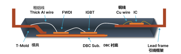 對(duì)于大功率應(yīng)用而言,封裝的散熱能力對(duì)于確保所需性能至關(guān)重要。高質(zhì)量封裝技術(shù)的關(guān)鍵在于能夠保持出色散熱性能的同時(shí)優(yōu)化封裝尺寸,且不降低絕緣等級(jí)。SPM31器件采用了DBC襯底技術(shù),使其具備卓越的散熱性能。這項(xiàng)技術(shù)提高了可靠性和散熱能力。功率芯片被物理固定在DBC襯底上(圖5)。