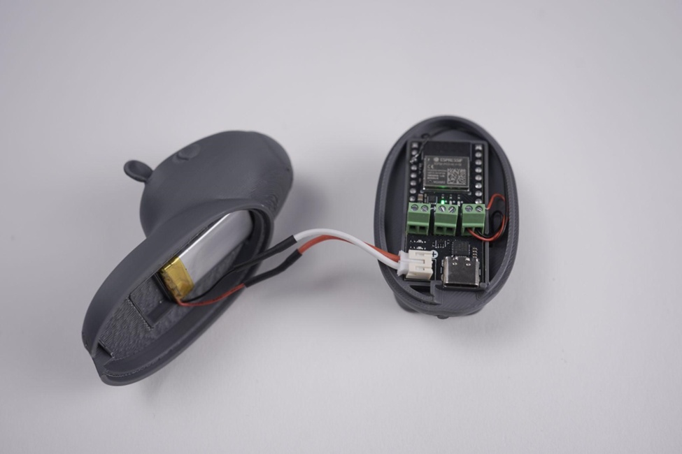 將按鈕穿過底部預(yù)留的孔,確保電線引腳置于外殼內(nèi),在腔內(nèi)用少量熱膠固定按鈕。