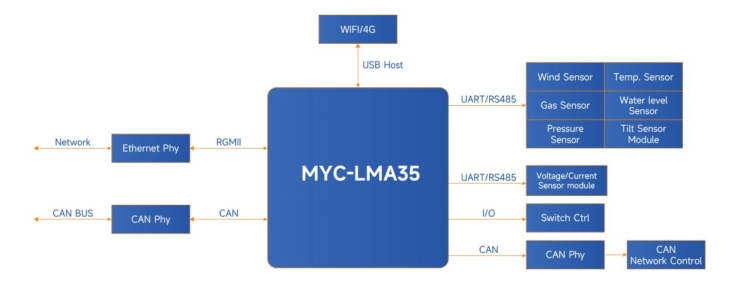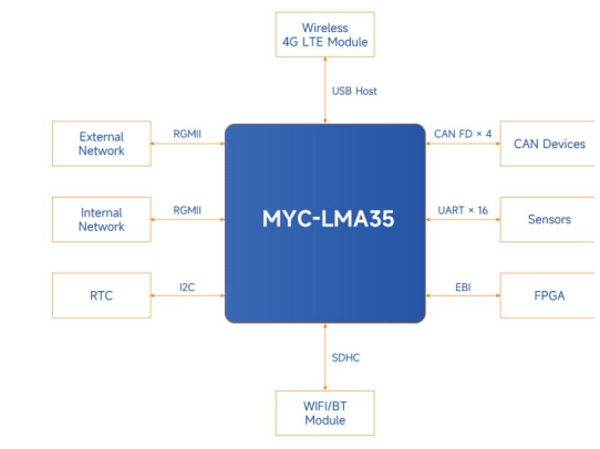 在工業(yè)網(wǎng)關(guān)上,米爾基于MA35D1核心板展現(xiàn)了強(qiáng)大的應(yīng)用能力。核心板支持USB HOST,方便連接4G模組,確保工業(yè)設(shè)備能夠進(jìn)行實(shí)時數(shù)據(jù)傳輸;配備兩路千兆以太網(wǎng)接口,確保高速數(shù)據(jù)傳輸;原生4路CAN FD接口可用于連接CAN 設(shè)備,提升工業(yè)自動化系統(tǒng)的互聯(lián)互通性;核心板能夠通過EBI與FPGA進(jìn)行高效數(shù)據(jù)交互,拓展系統(tǒng)的處理能力;原生UART能夠連接傳感器等多種外部設(shè)備,可檢測環(huán)境并采集數(shù)據(jù);可利用SDHC連接WIFI/BT模塊,增強(qiáng)無線通信的靈活性;I2C接口向外拓展連接RTC,確保系統(tǒng)時間準(zhǔn)確性;核心板還支持LINUX操作系統(tǒng),提供靈活的開發(fā)環(huán)境,適合工業(yè)應(yīng)用的定制需求?;谶@些性能MYC-LMA35核心板在工業(yè)網(wǎng)關(guān)中廣泛應(yīng)用,處理和管理來自不同設(shè)備的數(shù)據(jù)流。