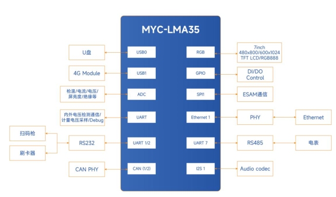 MYC-LMA35核心板在充電樁的應(yīng)用中展現(xiàn)了其強(qiáng)大的技術(shù)優(yōu)勢。MA35D1處理器配備原生17路UART接口,能夠利用UART接口實(shí)現(xiàn)內(nèi)外電壓檢測、計量電壓采樣和調(diào)試,也可以將UART接口根據(jù)需求轉(zhuǎn)換為RS232、RS485串口通信方式,連接刷卡器、電表和掃碼槍,使得其與電動車及其他設(shè)備的通信更加高效和靈活;核心板支持ADC,能夠監(jiān)測控制電壓電流和溫度,確保充電過程安全與高效;USB接口可連接U盤,實(shí)現(xiàn)數(shù)據(jù)存儲和更新;兩路千兆以太網(wǎng),可以實(shí)現(xiàn)高速數(shù)據(jù)傳輸,滿足充電樁實(shí)時監(jiān)控和遠(yuǎn)程管理的需求;支持SPI和I2C接口,為外部傳感器和模塊的連接提供了便利;I2S、RGB等多媒體接口,幫助實(shí)現(xiàn)人機(jī)交互的界面顯示和操作輸入。MYC-LMA35核心板支持的多種拓展外設(shè),使得其成為充電樁解決方案的理想選擇,推動智能充電技術(shù)的發(fā)展。