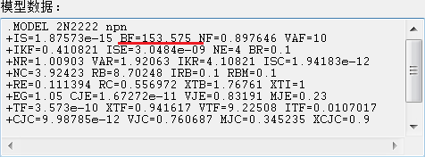 Q1(2N2222)的模型數(shù)據(jù)如圖所示,其中BF=153.575為交流電流放大系數(shù)。