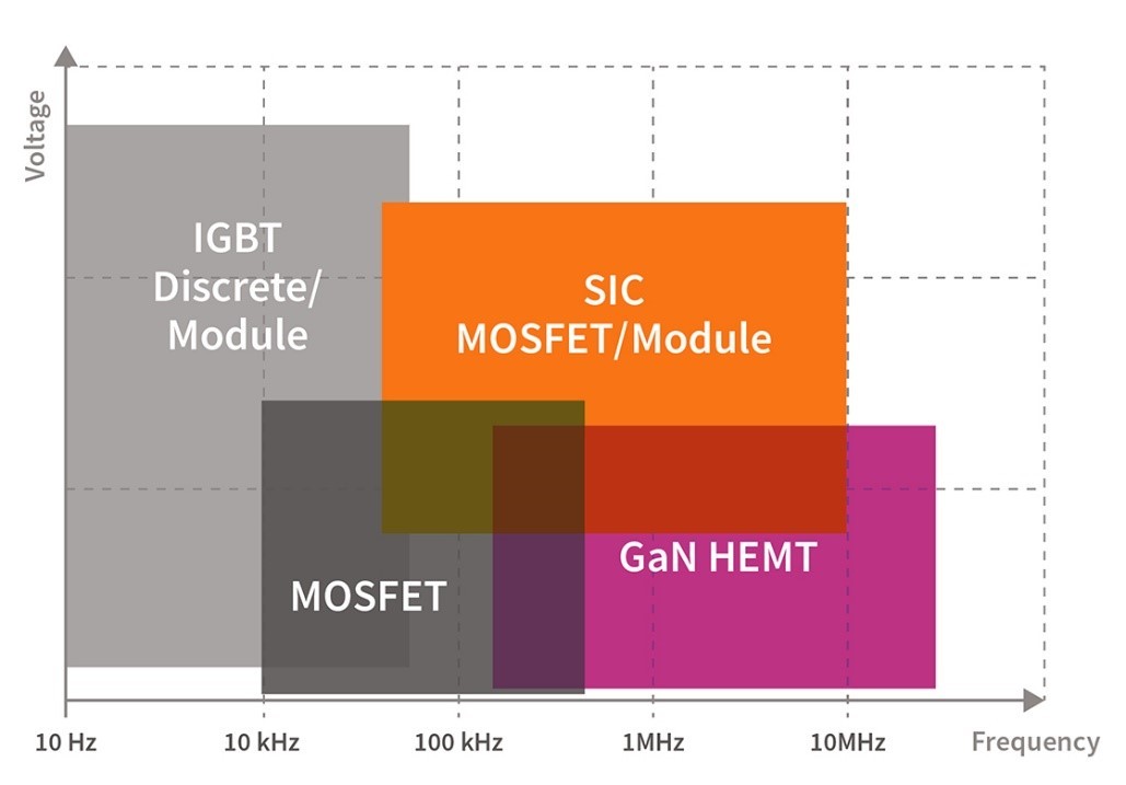 圖 1. Si、GaN 和 SiC 功率器件覆蓋整個(gè)功率范圍。