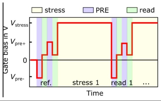 英飛凌提出了一種正 BTI (PBTI) 測(cè)試序列,以實(shí)現(xiàn)更出色的可重復(fù)性,如圖 3所示。預(yù)處理脈沖更接近地代表了應(yīng)用中的柵極開(kāi)關(guān),并減少了讀出延遲和器件歷史的影響。由于 SiC 中的 DC BTI 會(huì)引起可靠性問(wèn)題,因此需要通過(guò)優(yōu)化器件處理并使用適當(dāng)?shù)臏y(cè)量方法仔細(xì)評(píng)估來(lái)將其最小化。該測(cè)試促進(jìn)了這一過(guò)程。