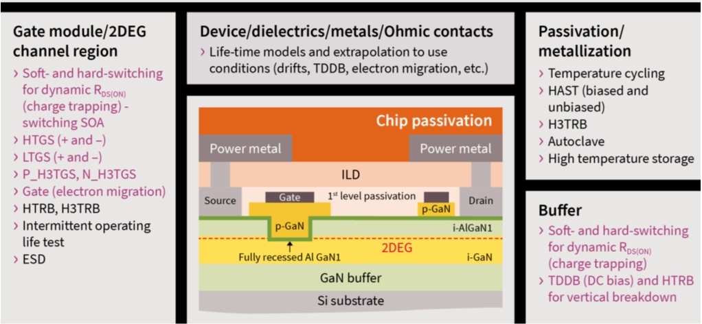 在 GaN 器件中,動(dòng)態(tài)R DS(ON)的影響是由加工過(guò)程中捕獲的電荷或由于動(dòng)態(tài)影響引起的,這些影響可以與通道中的二維電子氣 (2DEG) 密度相互作用并改變其密度,從而增加R DS(ON)。在開(kāi)發(fā)過(guò)程中,重要的是確保在典型應(yīng)用中相關(guān)的傳導(dǎo)損耗增加較低,并且動(dòng)態(tài)R DS(ON)不會(huì)失效。圖 4顯示了針對(duì)老化等的 GaN 專(zhuān)用測(cè)試摘要。通過(guò)這些測(cè)試意味著 GaN 器件合格,并且老化效應(yīng)最小化。