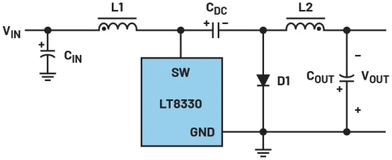 當(dāng)開關(guān)噪聲成為問題時(shí),CüK 轉(zhuǎn)換器可以產(chǎn)生比 IBB 轉(zhuǎn)換器噪聲更小的負(fù)輸出電壓。該拓?fù)淙鐖D 8 所示,具有兩個(gè)電感器和一個(gè)耦合電容器。該轉(zhuǎn)換器的優(yōu)勢(shì)在于其簡(jiǎn)單性,只需要一個(gè)低側(cè)開關(guān)來反轉(zhuǎn)輸入,它可以是 NMOS,因此效率很高。例如,LT8330只需要 8 個(gè)引腳,設(shè)計(jì)并不困難。該 IC 是 ADI 的穩(wěn)壓器之一,具有兩個(gè)集成誤差放大器,使其能夠檢測(cè)正或負(fù)輸出電壓。類似的穩(wěn)壓器如LT8331、LT8333、LT8334、LT8570和LT8580提供不同的等級(jí)和功能以滿足各種常見的應(yīng)用需求。