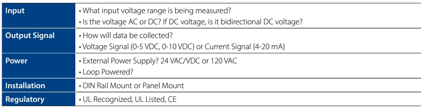 每個(gè)應(yīng)用都有獨(dú)特的要求。要選擇正確的電壓傳感器,請(qǐng)收集以下關(guān)鍵標(biāo)準(zhǔn),如表所示,并在下文進(jìn)一步描述。