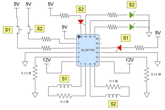 以下部分將描述使用SLG47105 HVPAK器件實(shí)現(xiàn)兩個(gè)螺線管的電流調(diào)節(jié)驅(qū)動(dòng)器。