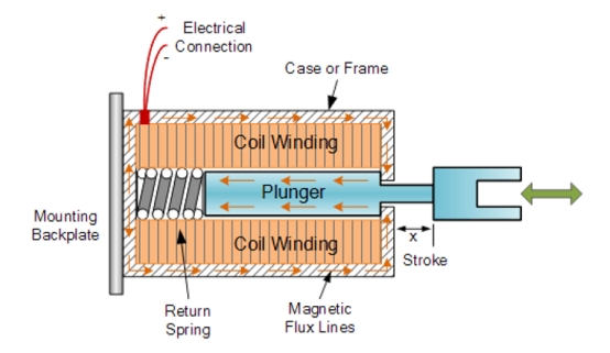 當(dāng)電流通過螺線管線圈時(shí),它會在內(nèi)部產(chǎn)生磁場。該磁場會產(chǎn)生拉動(dòng)柱塞的力。當(dāng)磁場產(chǎn)生足夠的力來拉動(dòng)柱塞時(shí),它會在螺線管內(nèi)移動(dòng),直到到達(dá)機(jī)械停止位置。當(dāng)柱塞已經(jīng)在螺線管內(nèi)時(shí),磁場會產(chǎn)生力將柱塞固定到位。當(dāng)電流從螺線管線圈中移除時(shí),柱塞將返回其原始位置,由螺線管中安裝的彈簧推動(dòng)。