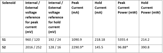峰值電流值是額定電壓下的螺線管額定電流。保持電流通過將峰值電流乘以 0.2(20%)計(jì)算得出。峰值和保持電流計(jì)算為內(nèi)部螺線管電阻上耗散的功率。感測電阻使用歐姆定律通過 0.11Ω 的感測電阻計(jì)算得出。S2 的額定線圈電阻使用額定螺線管電壓及其峰值電流值計(jì)算得出。