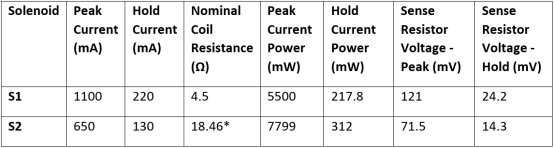 螺線管電流將以受控的峰值電流值開始,在初始延遲后,它將降低到保持電流值。我們?nèi)我舛x保持電流應(yīng)為標(biāo)稱峰值電流的 20%。根據(jù)此定義,可以計(jì)算保持電流中耗散的功率以及檢測電阻上的相應(yīng)電壓。表 2 顯示了每個(gè)螺線管的理想螺線管電流、耗散功率和檢測電阻上的電壓。
