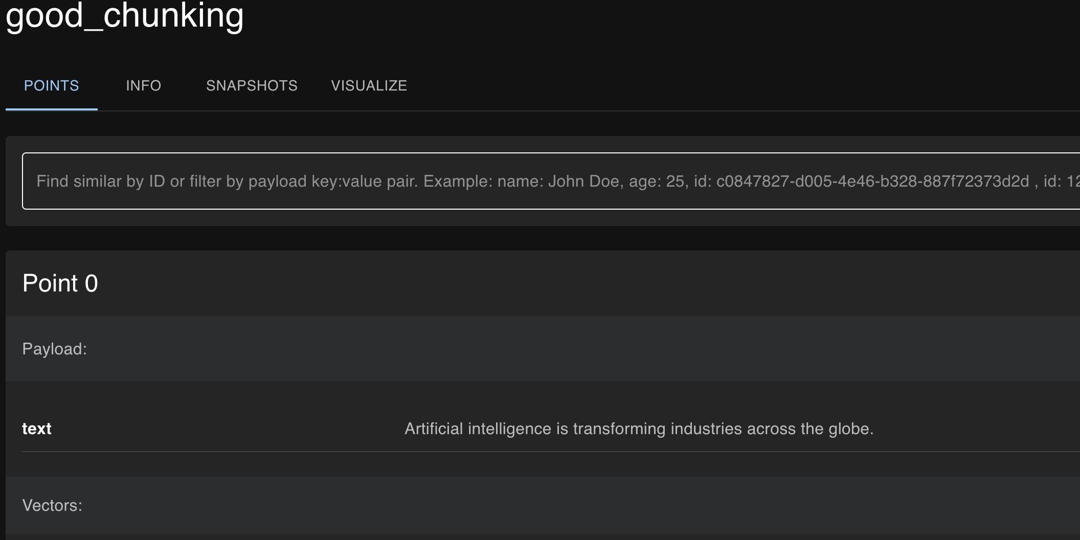 下面是來自 Qdrant Cloud 的塊的屏幕截圖,您可以看到元數(shù)據(jù)被添加到句子級塊中以指示來源和主題。