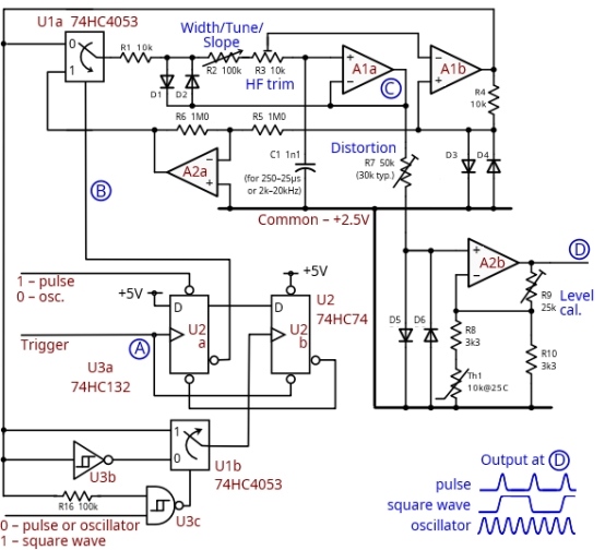 U1c 有兩個作用。當(dāng)要生成脈沖或連續(xù)正弦波時,它使 R14 短路并打開 R24,從而提供我們的標(biāo)準(zhǔn)工作條件,但在方波模式下,R14 留在電路中,而 R24 接地,這是額外的三波幅度和壓縮所需的。