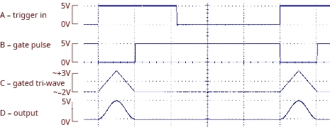 我們通過采用壓扁三角正弦波振蕩器的核心并添加一些邏輯和門控來產(chǎn)生脈沖,以便在觸發(fā)時(shí),它會(huì)產(chǎn)生單個(gè)周期,這些周期從基線上升到峰值,然后再次回落,遵循余弦曲線。圖 1中的示意圖顯示了基本原理。