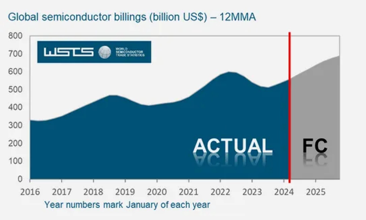 隨著全球人工智能(AI)和高性能運算(HPC)需求的增長,以及智能手機、個人計算機、服務器、汽車等市場的需求回暖,半導體產(chǎn)業(yè)正迎來新一輪增長浪潮。6月份,世界半導體貿(mào)易統(tǒng)計組織(WSTS)上調(diào)了對全球半導體市場的預期,預計2024年將實現(xiàn)16%的增長,市值估值達到6110億美元。據(jù)悉,這一增長主要得益于過去兩個季度的強勁表現(xiàn),尤其是在計算終端市場。與之形成對比的是WSTS在今年初曾預測2024年全球半導體市場的同比增長率為13.1%,總規(guī)模至5883.6億美元。無獨有偶,WSTS更是預計2024年和2025年市場都將實現(xiàn)強勁增長。
