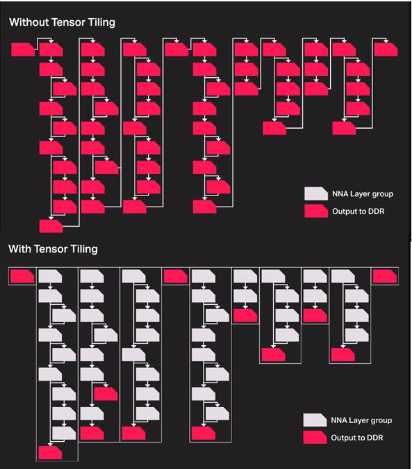 張量很大的多維陣列信息元是神經(jīng)網(wǎng)絡中使用的主要關鍵結構。傳統(tǒng)上,這些操作需要頻繁重復地從主存儲器存取,這會消耗大量的帶寬和功率。Imagination Tensor Tiling技術可有效地把張量分為多個區(qū)塊(tile)并分組更高效地進行處理,結合IMG Series4神經(jīng)網(wǎng)絡加速器(NNA)中的片上存儲器,可顯著降低功耗,節(jié)省芯片面積并降低成本。