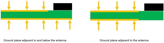 地面平面通常比天線長.操作的最低頻率將決定其長度.數(shù)據(jù)表將指定地面平面的需求,但它也意味著您將需要天線下面的一個保留區(qū)。如果空間很小,我們建議選擇需要很小地面平面的天線,以滿足通過載波輻射規(guī)格的效率要求。圖4顯示了地面平面如何能夠毗鄰或低于天線或兩者。
