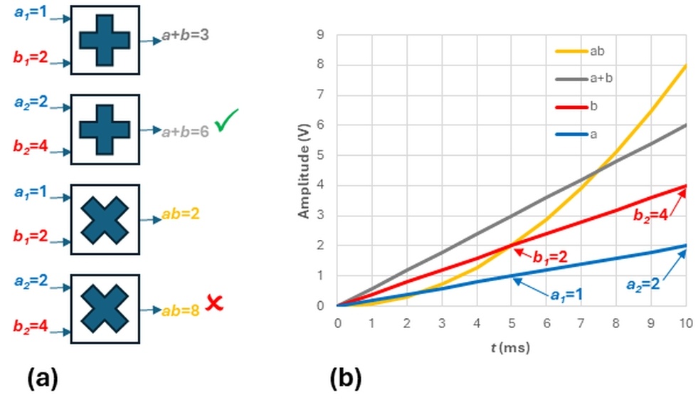 線性度的測(cè)試是一個(gè)系統(tǒng)是否堅(jiān)持疊加原理,這反過(guò)來(lái)又要求系統(tǒng)表現(xiàn)出加性和均勻性。如果輸入的話 A 產(chǎn)出 X 以及輸入 b 產(chǎn)出 y ,然后同時(shí)申請(qǐng) A + b 會(huì)產(chǎn)生 X + y .