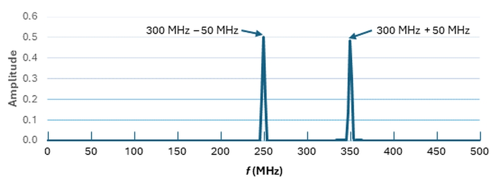 黑色痕跡的頻率含量不是很明顯,所以我們將借用上一系列的快速傅立葉變換(FFT)。?第4部分 包括整個(gè)系列的摘要)并仔細(xì)研究。 圖4 顯示混合器已取代了50兆赫和300兆赫的輸入信號(hào),其信號(hào)代表這些信號(hào)的和(350兆赫)和差(250兆赫)。