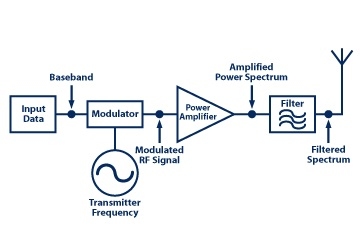 圖1:功率放大器是采用低頻率射頻信號并提高其功率的元件,不增加任何對格式、調(diào)制或其他因素的改變;有時需要在源(PA)和負(fù)載(天線)之間顯示濾波器,以盡量減少由于PA不完善而產(chǎn)生的不希望的信號。