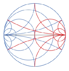 圖2在史密斯圖表中,電阻(紅色)和電抗(藍(lán)色)被繪制在一個(gè)代表歐姆的網(wǎng)格上。