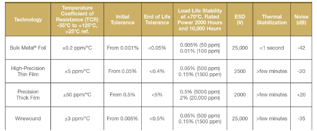 圖1有很多材料和技術可以用來制造高精度、低溫度的電阻器;這個表格顯示了它們的關鍵屬性和結果的折衷。