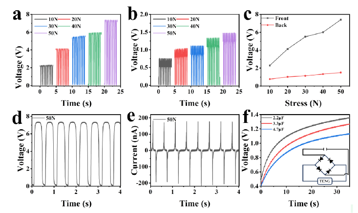 本案例使用Keithley 6517B靜電計(jì)測(cè)量了魚鱗TENG在不同壓力下的輸出電壓特性,以及魚鱗TENG在恒定壓力下的輸出電壓和電流穩(wěn)定性,在50N恒定壓力下,TENG的輸出電流保持穩(wěn)定,約為0.18μA。這一項(xiàng)測(cè)試需要測(cè)試儀器具有很高的電流分辨率以及極低的儀器底噪,才能測(cè)到這極小的穩(wěn)定值。