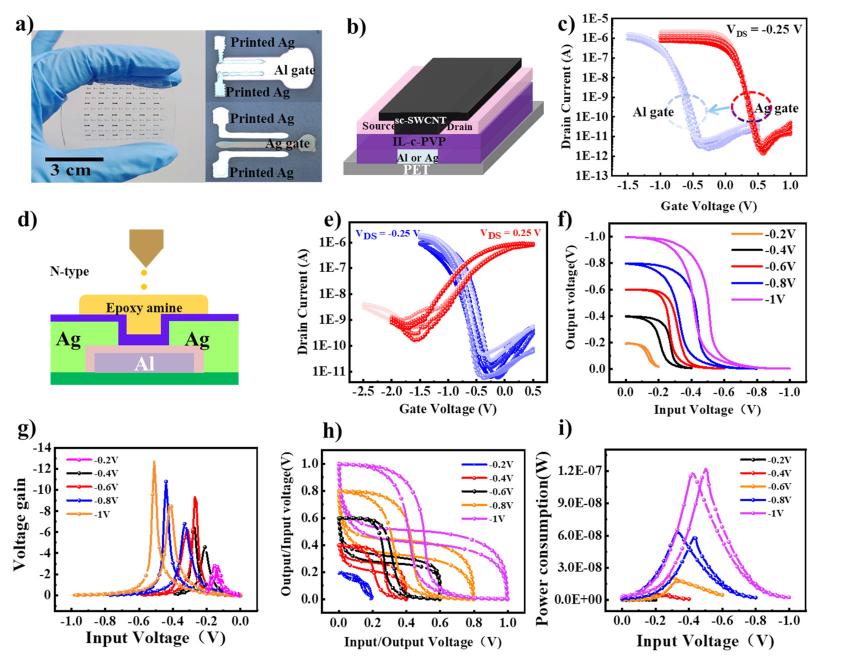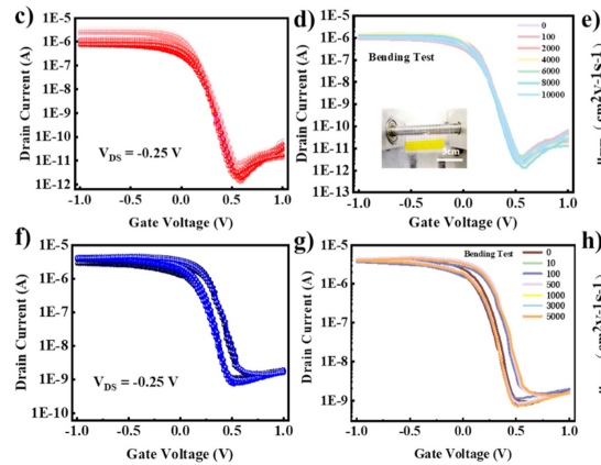 本案例通過(guò)使用Keithley 2636B和Keithley 4200分析儀在空氣中進(jìn)行了SWCNT TFT和CMOS反相器的所有電氣測(cè)量,偏壓(VDS)為-0.25V(或0.25V),掃描步長(zhǎng)為-0.01V(或0.01V)。使用上述儀器來(lái)測(cè)量制備的SWCNT薄膜晶體管的電學(xué)特性,如載流子遷移率、開關(guān)比、遲滯和亞閾值擺幅等,來(lái)評(píng)估材料在柔性電子器件中的應(yīng)用潛力。