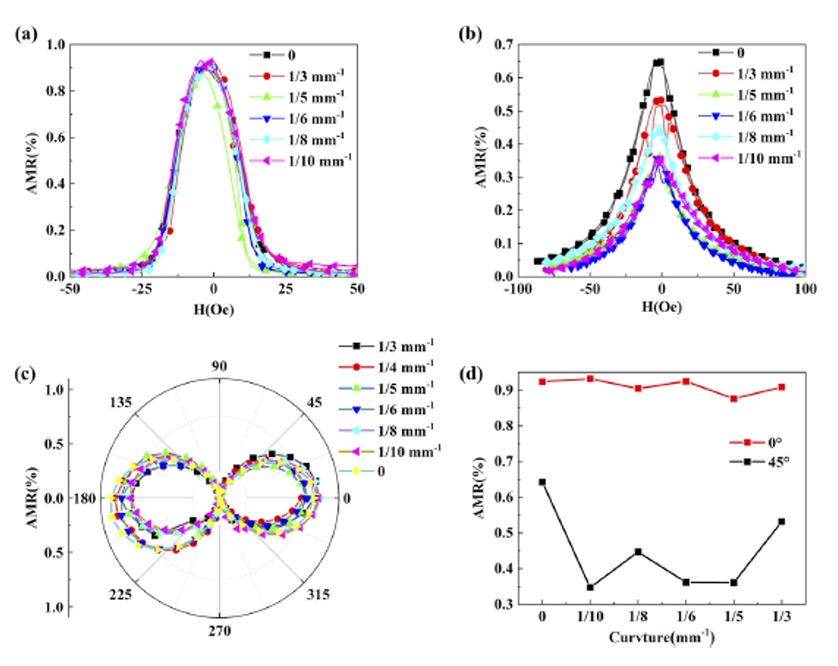 本文使用Keithley 6221提供了10μA的直流電流,通過(guò)兩個(gè)電極“I+”和“I-”沿著易軸方向傳遞電流。使用Keithley 2182A則連接到另外兩個(gè)電極“U+”和“U-”,用于測(cè)量由于外部磁場(chǎng)作用而產(chǎn)生的電壓變化。這樣可以得到AMR比率。