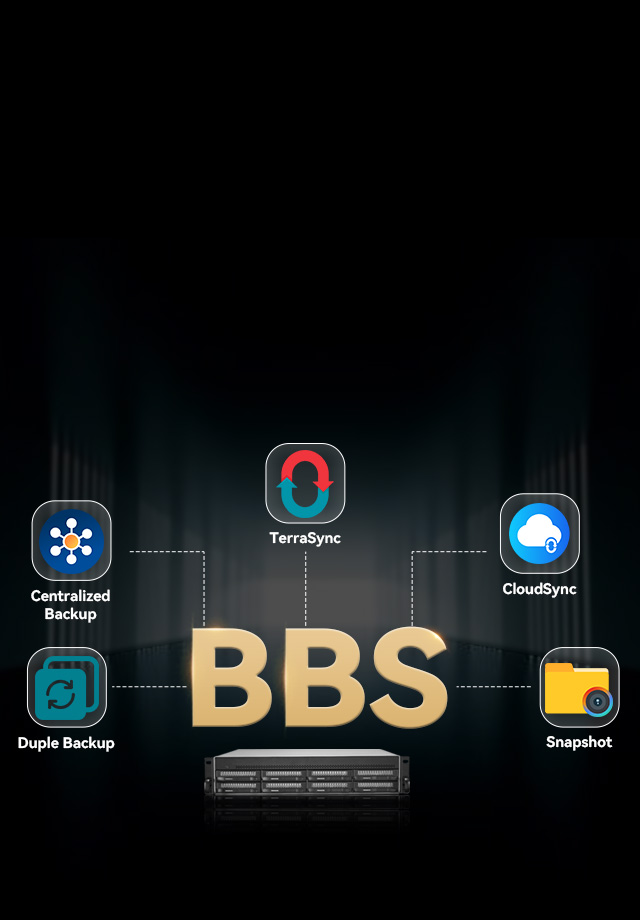 4. BBS全場景備份解決方案:為了讓更多人更好地解決數(shù)據(jù)存儲安全和備份的問題,鐵威馬提供了BBS全場景備份解決方案,其核心功能有TerraSync、中央備份、雙重備份等,通過備份、快照、同步、異地容災等多重保護機制,我們構(gòu)筑起一道堅實的數(shù)據(jù)保護屏障,確保在各種應(yīng)用場景下,都能對不同終端或服務(wù)器的數(shù)據(jù)進行安全保障。