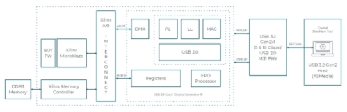 為了確認USB 3.2 Gen2x1器件的控制器,使用了來自制造商AMD / Xilinx的現(xiàn)成商用的FPGA平臺。物理接口是通過使用來自M31公司的外部PHY卡來實現(xiàn)。